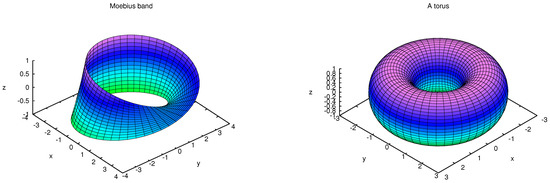 Figure 3. Outputs of (left) the 3D surface Möbius band s ( x , y ) = 3 + y cos x 2 cos x i + 3 + y cos x 2 sin x j + y sin x 2 k , and (right) the torus t ( θ , ϕ ) = ( 2 + cos θ ) cos ϕ i + ( 2 + cos θ ) sin ϕ j + sin θ k .