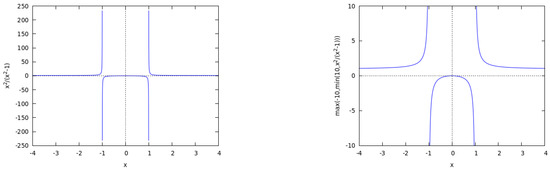 Figure 4. (left) A 2D plot of y = f ( x ) = x 2 x 2 1 without any restriction in the vertical scale. (right) The same plot as in the left panel but the vertical axis is restricted to 10 y 10 .