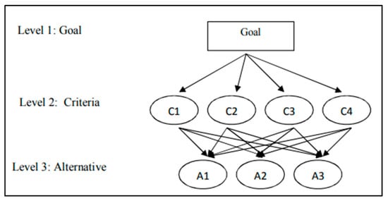 - A decision hierarchy is constructed: After selecting the criteria and alternatives, a hierarchy is built with the objective placed on the top, the criteria on the second level and the alternatives on the third level. This is an overall framework no matter each problem as described in Figure 3.