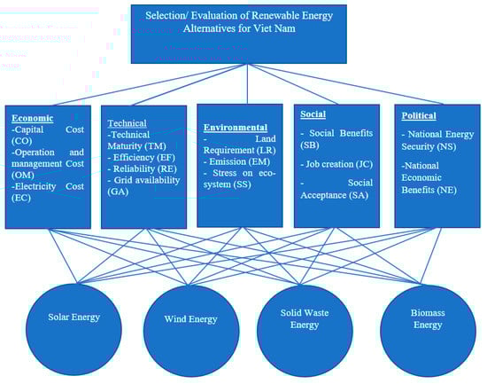 With the expansion of its industrial and manufacturing sectors, with the goal of positioning Vietnam as the world’s new production hub, Vietnam is forecast to face a surge in energy demand. Today, the main source of energy of Vietnam is fossil fuels, which are not environmentally friendly and are rapidly depleting. The speed of extraction and consumption of fossil fuels is too fast, causing them to become increasingly scarce and gradually depleted. Renewable energy options, such as solar, wind, hydro electrical, and biomass, can be considered as sustainable alternatives to fossil fuels. However, to ensure the effectiveness of renewable energy development initiatives, technological, economic, and environmental must be taken in consideration when choosing a suitable renewable energy resource. In this research, the authors present a multi-criteria decision-making model (MCDM) implementing the grey analytic hierarchy process (G-AHP) method and the weighted aggregates sum product assessment (WASPAS) method for the selection of optimal renewable energy sources for the energy sector of Vietnam. The results of the proposed model have determined that solar energy is the optimal source of renewable energy with a performance score of 0.8822, followed by wind (0.8766), biomass (0.8488), and solid waste energy (0.8135) based on the calculations of the aforementioned methods.