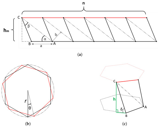 Figure 1a represents an n faces polygon Kresling pattern in planar state, which forms a polyhedral cylinder when assembled. The triangulated polyhedron geometry is resolved by , , at the planar state, where a, , and are constant values. The angles and are the main design criteria to create the cylinder, because the strength of the structure depends on them. Zhai et al. suggest that, for small angles around , the structure is easy to deploy and easy to collapse, and for greater angles around , the structure is hard to deploy and hard to collapse [31]. For large angles, the structure is stronger and able to support loads. To obtain a symmetric structure we consider mm; therefore, according to Hunt [32], where and . The angle has been obtained from the geometric resolution proposed by Jianguo et al. [33]. Here h is considered to be known, and d can be obtained by . Consequently, our prototype has been designed with mm, mm, and , thus a flexible deformable link is created, and the unitary ABC triangle angle is > to achieve continuous strain at each member tension or compression in the deployed and collapsed states.