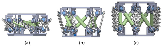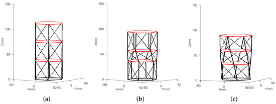 Three-sections link kinematics validation, with parameters , and mm. (a) Completely deployed link. (b) Only one section folding. (c) Three sections folding.