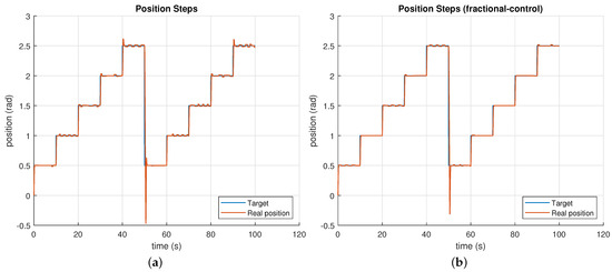 In the case of the integer controller (Figure 24a), the lower peak position reaches (rad) with a stabilization time of (s) and a maximum overshoot of , while in the case of the fractional controller (Figure 24b), the minimum position is (rad); it has no overshoot and the stabilization time is (s). Therefore, it can be concluded that the fractional controller is not only robust but also faster than the integer controller.