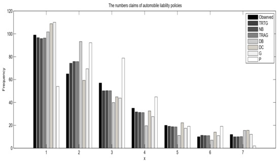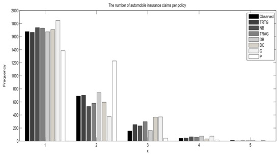 In this section, the TRTG distribution was fitted into three real actuarial data sets and compared with the transmuted geometric (TRAG), discrete Burr (DB), discrete Chen (DC), negative binomial (NB), geometric (G), and Poisson (P) distributions.