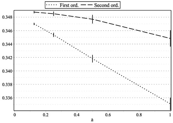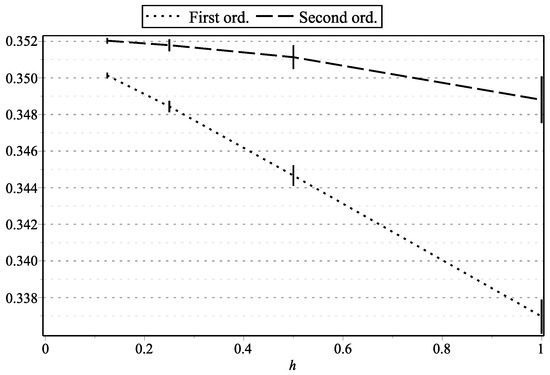 Figure 1, Figure 15, and Figure 17 represent the values of with “low” volatility (, , , ). Figure 2, and Figure 16 and Figure 18 represent the values of with “high” volatility (, , , ). Figure 3, Figure 5, Figure 7, Figure 9, Figure 11, and Figure 13 represent values of with “low” volatility (, ). Figure 4, Figure 6, Figure 8, Figure 10, Figure 12, and Figure 14 represent the values of with “high” volatility (, ). In all the graphs, the error bars show 95% confidence intervals. To shorten the bars, for approximation time-step sizes , , we have generated samples of approximations.