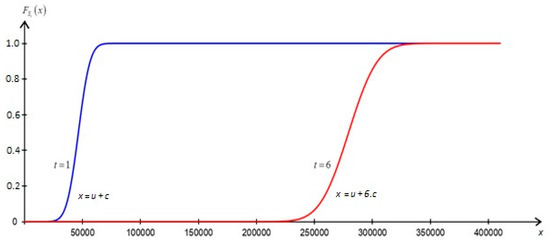for given values . The random variable has a compound distribution with Poisson parameter , with the distribution laws and characteristics expressed according to the collective risk model equations. We work with an expected total claim amount and variance . According to (2), we can express the ruin probability at a particular point of time t for the reserves needed to cover the claims up to time t. We express the risk premium according to the mean value principle with a risk addition and according to the variance principle for calculating the risk premium with an addition . We can estimate the ruin probability in continuous time at time t using the following equation: