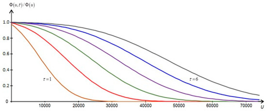This approximates the ruin probability for the surplus process since it includes all the cash flows, i.e., the resulting positive as well as negative values of the surplus. The ruin probability in some time interval (0, t) is the sum of the probabilities of all such possibilities. Therefore, the final expression for the ruin probability immediately before time τ, given the characteristics of the random variable and Equations (4), (6) and (8) is the following: