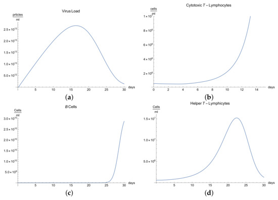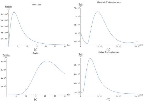 Immune response to viral antigens penetrating into an organism is determined by two responses: the humoral response, which is activated by B-lymphocytes, which in turn produces antibodies and the adaptive response, which activates the cytotoxic lymphocytes. It is clear from Figure 1b,c that only after a certain amount of antibodies and cytotoxic T-lymphocytes is produced until the 5th to 14th days will a stable diminution of V(t) begin down to zero concentrations of the viral load.