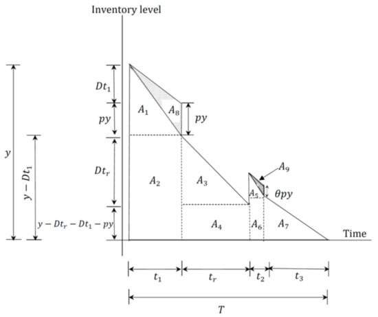 and are calculated in the following mode. is computed with the multiplication of the holding cost and the total inventory during the cycle, which is determined by the sum of the areas: in Figure 1. Where: , , , , , , and .