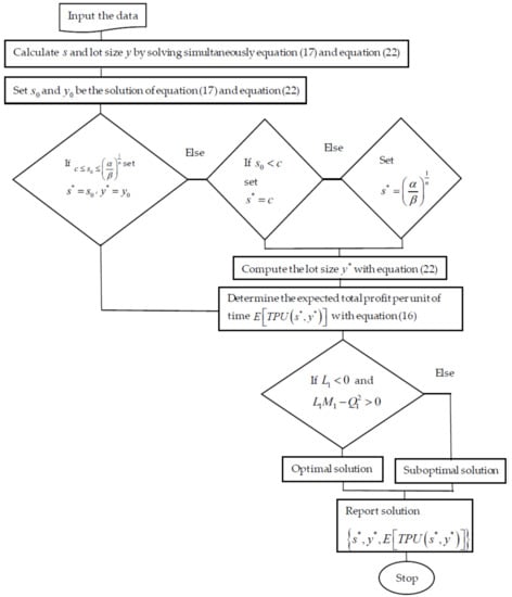 | Step 1. Provide the data of the inventory system. Step 2. Obtain the selling price and lot size by simultaneously solving Equation (30) and Equation (35). Step 3. Set and to be the solution of Equation (30) and Equation (35); if , then , , and go to Step 5. If , then set and go to Step 4. Otherwise, set and go to Step 4. Step 4. Find the lot size with Equation (35). Step 5. Calculate the expected total profit per unit of time with Equation (29). Step 6. If and , then the solution is optimal. Otherwise, the solution is suboptimal. Step 7. Report the solution as Step 8. Stop. |
