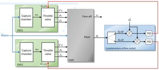 Because the OWCs are integrated into the ITI Energy barge and will have opposing moments on it, the proposed airflow control strategy relies on the platform pitch as explained in Figure 3. In practice, the input to the FOWT system is the wave elevation , which can be measured by a wave height recorder installed in the central moon pool of the platform or by an acoustic Doppler current profiler (ADCP) mounted at the bottom of the barge. As for the FOWT DOFs, both the platform pitch and tower top fore-aft displacement may be measured by two accelerometers placed at the base and top of the tower, respectively [15].