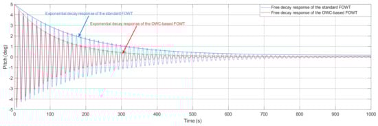 Figure 4 shows the free decay response of the platform pitch for both structures, and it can be seen that both initially start from 5 degrees, which is the initial perturbation introduced to both systems. It can be seen that during the simulation with time, the platform pitch is damped out, but with the proposed OWC-based FOWT the platform pitch is reduced compared to the standard FOWT.