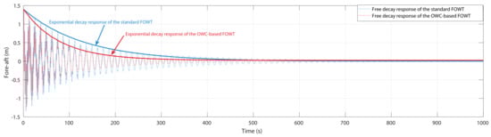 Free decay response for the tower top fore-aft displacement in the standard FOWT and OWC-based FOWT.