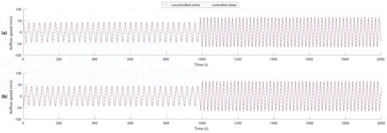 When simulating the OWC-based FOWT model, the airflow speed in both OWCs is shown in Figure 7. The effect of using the proposed airflow control can be seen in both airflows of OWC1 and OWC2 in the red curves, which have been compared to the airflow of the uncontrolled system, where the valves are always open in the blue curves. It can be seen that when the control is activated the valve plates reduce the airflow speed.