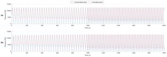 The effects of controlling the valves can be seen in the pressure of the controlled valves in the red curves. In fact, thanks to the closing of the valves, the pressure was maintained at a higher value compared to the uncontrolled pressure, in the blue curves, where it goes down to the atmospheric pressure value.