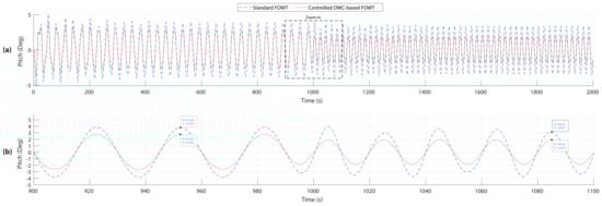 Obtained platform pitch in both structures. (a) Platform pitches. (b) Zoom-in of the platform pitches.