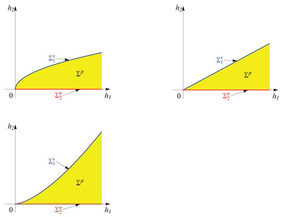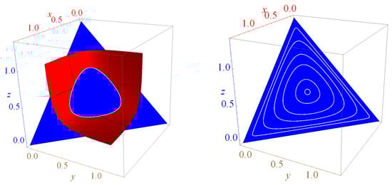 Remark 7. Consider that system (15) describes the dynamics of the interactions between three categories of a constant population of total size h. After an interaction between individuals from distinct categories, they can change their category. At a moment t, we denote by the number of individuals of these categories. At , the initial conditions are such that and . The above analysis shows the following types of behaviors. First, if , then we obtain a periodic behavior around the stable equilibrium . Second, if , then for all since the plane of equation is an invariant set of our system. In this case, system (15) reduces to , and hence x increases in time and y decreases, that is approaches in infinite time (the heteroclinic orbit ). Analogously, if then approaches , and if then approaches . Finally, if is an equilibrium state, then the number of individuals from each category stays unchanged.