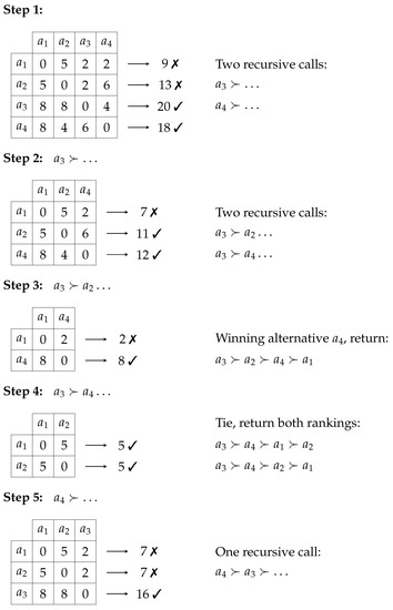 - ME-CW: Checks whether the Condorcet winner exists for the given profile of rankings. If this is the case, then the recursive call of the first level is made only for the Condorcet winner and not for all the other alternatives with a value of .
