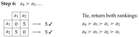 Notice that there is a special case that can be found in some profiles of rankings. Consider a profile of rankings with an even number of voters m. If two alternatives that are tied (each of them is preferred to the other one by voters) are considered at the end of the recursive process, then the matrix of dimension obtained from the recursive process has two equal concordance indexes, i.e., . In this case Mork-Exact does not determine what to do as the largest concordance index does not exist. It is necessary for the implementation of the algorithm to take into account this scenario, which implies that the recursive process must return both rankings as tentative solutions.