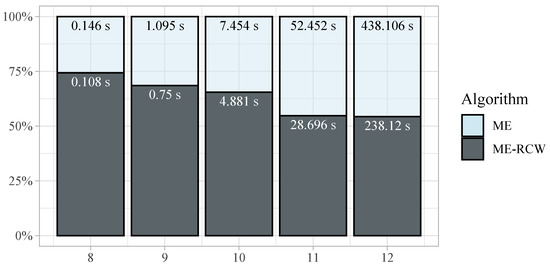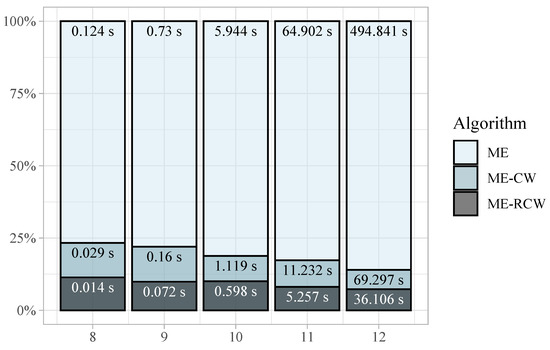 The results of the above-detailed experiments are presented in this section. Figure 2 presents the results obtained for the list of profiles of rankings for which the Condorcet winner exists. Each bar represents the average time for a different number of alternatives, showing that the execution time of the basic algorithm ME is reduced by at least 75% for the ME-CW algorithm and by around 90% for the ME-RCW. Note that the Condorcet winner exists for 28–77% (depending on the values of n and m) of the generated profiles of rankings.