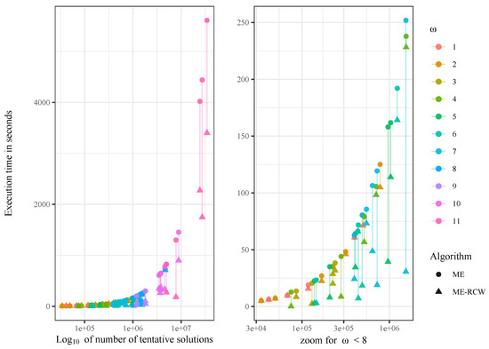For a better understanding of the results, a detailed visualization is presented in Figure 4. The x-axis in both plots of the figure has been obtained with a transformation of the number of tentative solutions explored for each profile. On the left-hand side, a complete view of the results given by the algorithms ME and ME-RCW for the profiles of rankings with for which the Condorcet winner does not exist is shown. Notice that the execution time soars for high values of in the basic implementation of the algorithm ME according to our experiments. On the right-hand side, the same plot is zoomed highlighting the values of , where a similar behavior can be observed. Note that the greater the value of is, the bigger is the gap in the execution time between both algorithms.