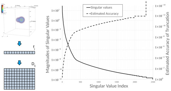 (left) Schematic depiction of constructing the solution data matrix: 3D solutions are reshaped into vectors which are then stacked as rows of the solution data matrix . (right) Singular values of the solutions data matrix and estimated accuracy plotted on logarithmic scale.