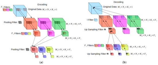 The architecture of autoencoders applied involved convolutional layers, thus making them convolutional autoencoders. As with much of machine learning, there is no specific way that such a network must be constructed. Generally speaking, a 3D convolutional autoencoder will have an encoder with layers arranged as depicted in Figure 2a, and a decoder with layers as depicted in Figure 2b. Figure 2a shows three convolutional filters being applied to the original, resulting in the next three data blocks (color coded to match). These data blocks are then reduced in size by the application of a pooling filter. Another round of convolutional filters is applied, followed by another pooling filter. In Figure 2b, that process is occurring in reverse. The three small data blocks in the beginning are up-sampled to increase their size, then go through a set of convolutional filters. This result is up-sampled again before a final convolutional filter returns the data block to its original dimensions.