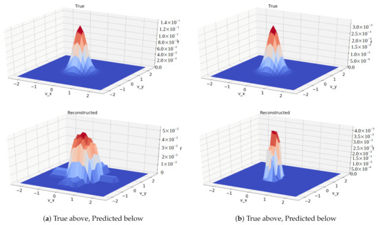 The results show promise that the convolutional architecture is capable of identifying and capturing important features in this data set, even with a significantly smaller number of variables. This provides hope that machine learning algorithms will be able to compute such solutions with far less computational effort and memory usage than traditional methods. It is most notable that the peaks of the reconstructed graphs have been rounded off and do not reach as high as the true data. Still captured though is the location and general Maxwellian shape, with the reconstructions from the network with the tighter restriction definitely being lossier than those from the less restricted network.