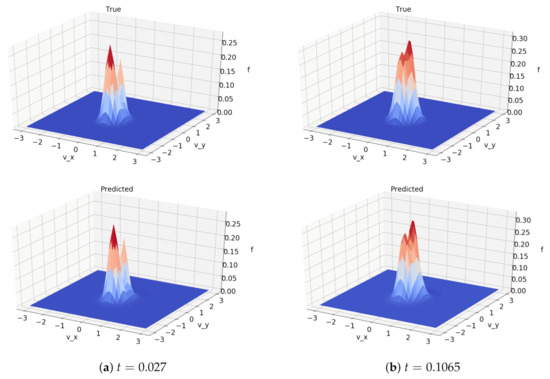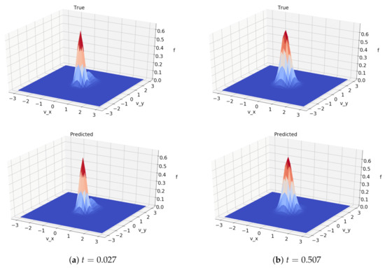 The Python implementation of this method took about 6 min to carry out 667 time steps and about 9 min to carry out 1000 time steps, an estimated times faster than the method of [6]. That method uses a discontinuous Galerkin discretization and takes about 40 h on a single CPU to carry out 1000 time steps. The machine-learned method thus greatly outperformed the method of [6]. The CPU time for both methods to perform one evaluation of the collision operator are summarized in Table 1. The CPU time for the machine-learned method also shows significant improvement compared to times reported in [10] for a fast spectral method.