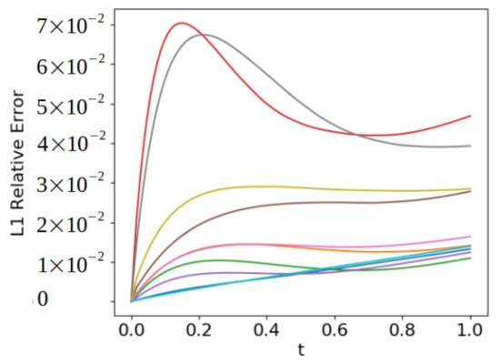 Figure 7 demonstrates how the absolute error between the true solution and the predicted solution evolves over time. The total magnitude of the difference remains low throughout the duration of the simulation, being under 10% of the norm of the true solution. There is also a consistent behavior among all the error curves, mainly that the difference grows the most during the first few iterations, then starts to flatten out.