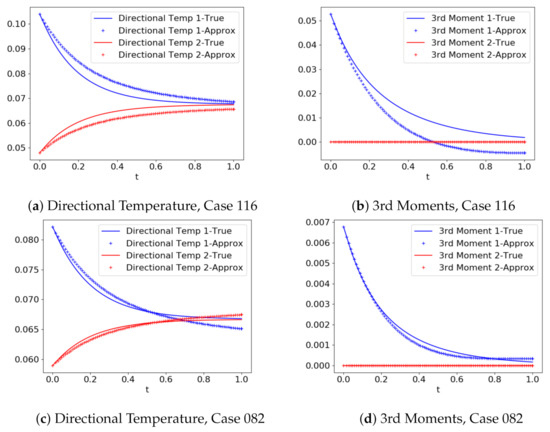 It is now of interest to see the effect the error has on the moments of the solution. Figure 8 shows a comparison of second and third order moments between the predicted and true solution. The lower order moments corresponding to mass, momentum, and temperature moments are not shown because they match exactly with the analytically computed solution’s moments. Generally, the moments of the predicted solutions followed the true moments and headed towards the steady state. They did not however perfectly arrive and remain at the steady state. In some cases the moments of the predicted solution cross over each other, and in other cases they simply fail to meet. The higher order moments exhibited similar behaviors, even more so than the lower order moments, but for many applications moments higher than 3rd order will not be as important.