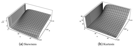 The skewness () and kurtosis () coefficients of the distribution can be obtained by using (5) via the softwareMATHEMATICA. They are not given here for the sake of brevity. However, the surface plots of the and measures of the α-GlogM distribution are illustrated in Figure 2.