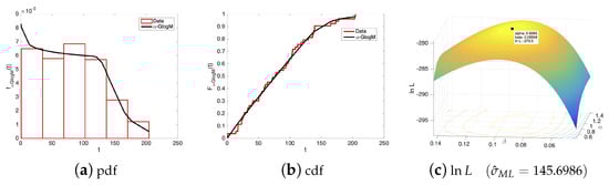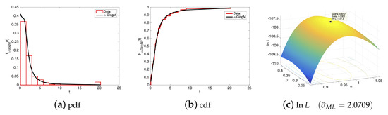 It can be seen from Table 4 that the AIC, RMSE, AD and KS values for the -GlogM distribution are smaller, and that and are greater than the corresponding values for the BE2 and SGR distributions. These values show that the -GlogM distribution exhibits a better modeling performance than the BE2 and SGR distributions. Therefore, the -GlogM distribution can be considered as an alternative to the BE2 and SGR distributions. The fitting performance of the -GlogM distribution and surface plot of the function are also illustrated in Figure 3.