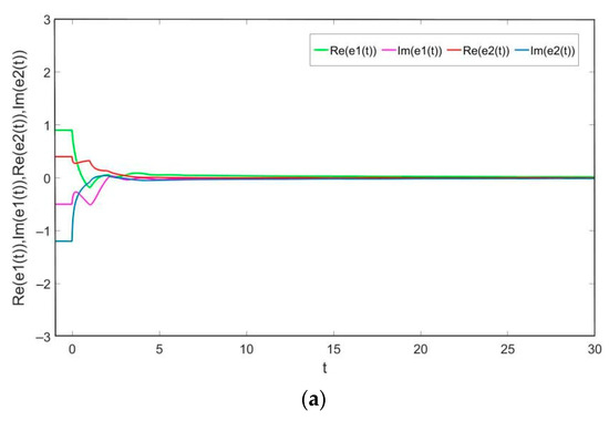 The state trajectories of the real and imaginary parts of the error system (10) and error norm trajectory curve are depicted in Figure 2 when , which shows that the system (19) and the system (20) can reach the finite-timeprojective synchronization under the feedback controller(11). Figure 3 displays the state trajectories of the real and imaginary parts of the error system (10) and error norm trajectory curve when , which shows that the system (19) and the system (20) will accomplish the complete synchronization under the feedback controller(11).