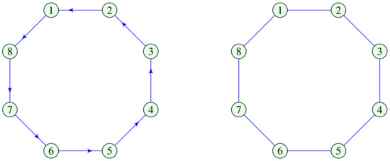 as shown in Figure 1 (left), for . Rows of the adjacency matrix indicate the corresponding vertex connectivity. In the first row, there is value 1 at the position N. It means that the vertex 1 is related to vertex N by a directed edge between these two vertices. In the second row there is value 1 at the first position, meaning that the vertex 2 is connected to vertex 1 with an edge, as shown in in Figure 1 (left).