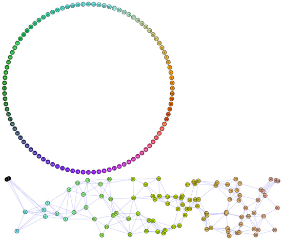 A graph consists of N vertices, , which are connected with edges. The weight of edges are [24,25,26]. For the vertices m and n which are not connected, by definition . The weights of edges are the elements of an matrix, . The graphs can be directed and undirected. For undirected graphs it is assumed that the vertices m and n are connected by the same edge weight in both directions, resulting in a symmetric weight matrix , when holds. A graph is unweighted if all nonzero elements of its weight matrix, , are equal to 1. In this case the weight matrix, , assumes specific form and the edges are represented by a connectivity or adjacency matrix, . In addition to the adjacency and weight matrix, or , in graph theory several other matrices are used. All of them can be derived from the adjacency and weight matrix. A matrix that indicates the vertex degree in a graph is called the degree matrix. It is of diagonal form and its common notation is . The elements of the degree matrix are obtained as a sum of all weights corresponding to the edges connected to the considered vertex, n. The diagonal elements of are equal to . A combination of the weight matrix, , and the degree matrix, , produces one of the most commonly used matrix in the graph theory, the graph Laplacian. It is defined by