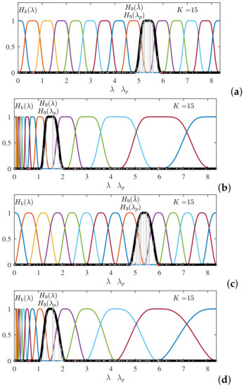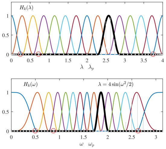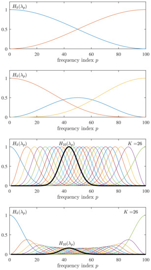 We shall use the spectral approach to perform vertex–frequency localization. The graph Fourier transform localized in the spectral domain (LGFT) is defined as an inverse graph Fourier transform of the graph Fourier transform, , multiplied by a spectral domain window, . The spectral domain window is nonzero at and around the spectral index k. Therefore, the element-wise LGFT is calculated using