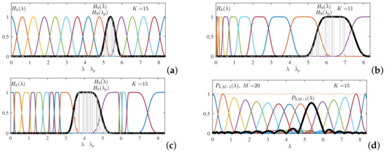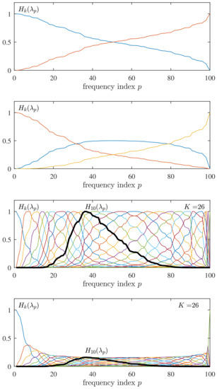 The set of discrete scales, denoted by , is used for the wavelet transform calculation. The corresponding spectral transfer functions are , . The father wavelet (low-pass scale function) is denoted by . It plays the role of the low-pass function in the LGFT, .