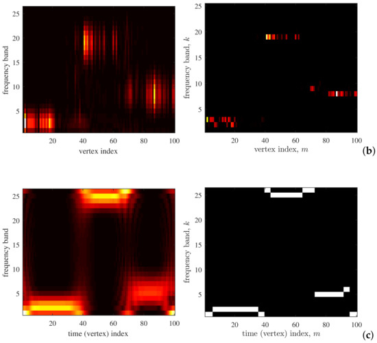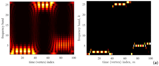 Processing of big data, whose domain is irregular and can be represented by a graph, has attracted significant research interest [1,2,3,4,5,6,7,8,9,10]. For big data, the possibility of using smaller and localized subsets of the available information is crucial for their efficient analysis and processing [11]. In addition, in practical applications when large graphs are used as the signal domain, we are commonly interested in localized analysis than in global behavior. In order to characterize the vertex-localized behavior of signals and their narrow-band spectral properties, the joint vertex–frequency domain analysis is introduced. This analysis represents a natural analogy to the time–frequency analysis, a well-established area in classical signal processing [12,13,14].