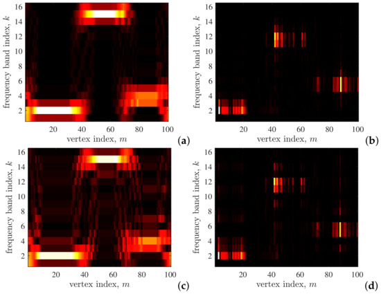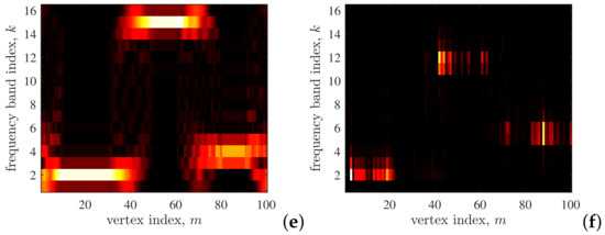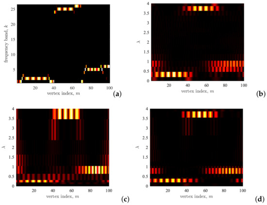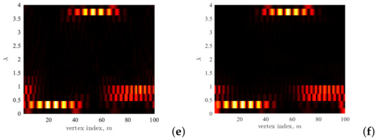 Vertex-Varying Filtering. For the vertex-varying filtering of the graph signals using the vertex–frequency representation we can use a support function in the vertex–frequency domain. Then, the signal that is filtered in the vertex–frequency using the LGFT is obtained as .