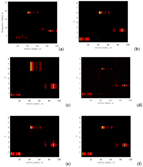 - Stanković, L.; Daković, M.; Sejdić, E. Vertex-Frequency Analysis: A Way to Localize Graph Spectral Components [Lecture Notes]. IEEE Signal Process. Mag. 2017, 34, 176–182. [Google Scholar] [CrossRef]