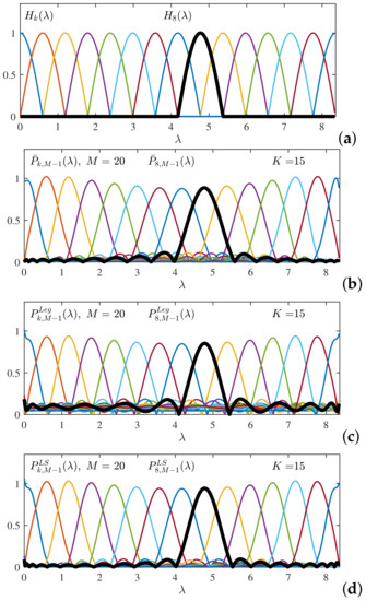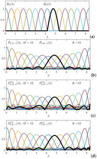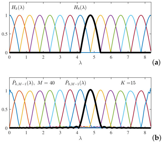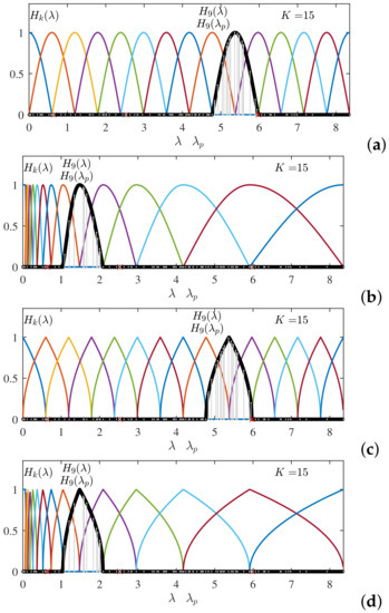 - Another approach that allows us to avoid the direct GFT calculation in the implementation of graph filters is in approximating the given transfer function, , by a polynomial , using continuous variable .This approximation does not guarantee that the transfer functions and its polynomial approximation will be close at a discrete set of points , . The maximal absolute deviation of the polynomial approximation can be kept as small as possible using the so-called min–max polynomials. After the polynomial approximation is obtained the output of the graph system is calculated using (10), that isThis approach will be presented in Section 5.