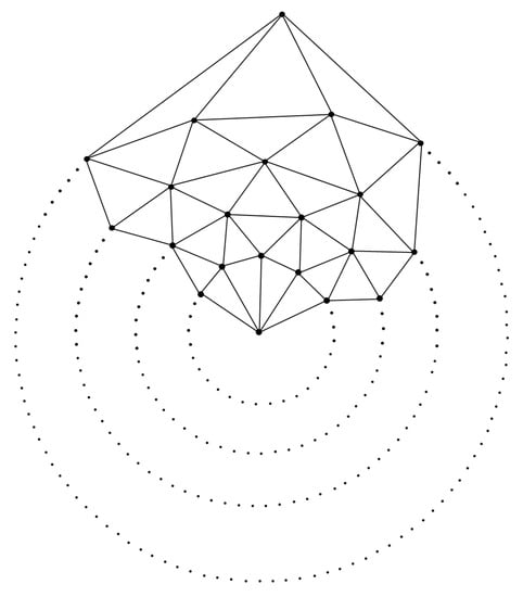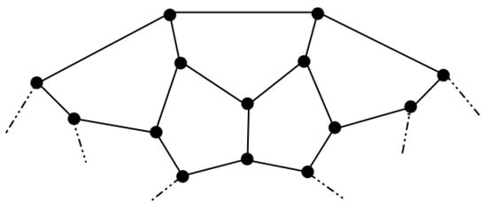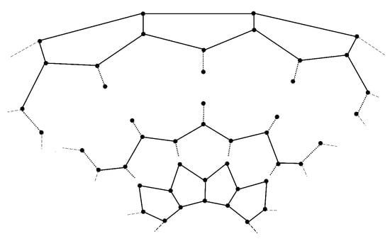 Miller et al. [17] studied different variations of by describing its dual, and the dual G represented as , for a given planar graph. The construction of G is performed by adding a vertex in the internal face of G. If their corresponding faces share an edge, then it should be joined. This new polytope is represented as . The family of graphs can be generated from the graph of when a layer of hexagons is added between the two pentagonal layers. The graph of can be viewed in Figure 4.