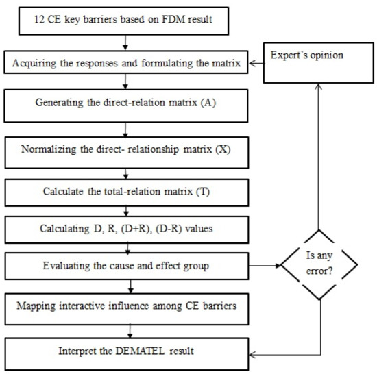 The DEMATEL method was used to analyze and develop a structural approach of causal relationships from among the determined CE adoption obstacles. The Science and Human Affairs Program of the Battelle Memorial Institute of Geneva (1976) introduced the DEMATEL method to overcome and learn complex criteria and intertwined problems [54]. DEMATEL, a well-known technique, is often used to analyze judgement problems in Japan [67]. DEMATEL depicts the causal relationships among numerous variables and serves as a structural framework map. Comparing with other models, DEMATEL has a major advantage in that it can generate possible conclusions using minimum data [68]. Other methods can also be implemented for the analysis of obstacles, such as interpretive structural modeling (ISM) and the analytical network process (ANP). In opposition to ISM, the DEMATEL approach helps with the determination of contextual relationships from among the obstacles and stress the impact of their interrelationships. In addition, the proportion of obstacles, having cause–effect relationships, is determined as well [69]. Furthermore, DEMATEL appears to be more useful in the evaluation of complex systems than ISM when analyzing cause–effect interrelationships among subsystems [62]. The DEMATEL approach not only converts interdependency associations into a cause–effect cluster using equations but also discovers the critical obstacles of an intricate system of obstacles with the help of an impact association map [64]. Scholars can better use the DEMATEL approach determining the causal interrelationships among the obstacles from within the framework of an issue and explain their conceptual interrelationships, compared with other modeling methods such as ANP, TISM, and GTMA [70]. The steps of the DEMATEL analysis process are presented in Figure 2.