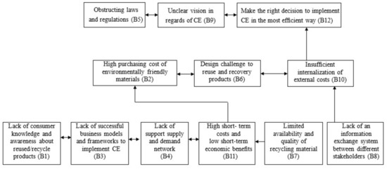 According to in Table 10, B5 (obstructive laws and regulations), B9 (unclear vision with regard to CE), and B12 (making the right decision to implement CE in the most efficient way) were ranked at Level 1. Level 2 contained B2 (Environmentally-friendly materials’ high cost for purchasing), B6 (Reuse and recovery products challenge design), and B10 (insufficient internalization of external costs). Finally, B1 (Consumer lacking knowledge and awareness of reuse/recycling), B3 (Lack of successful business models and frameworks for CE implementation), B4 (Lack of support for a supply and demand network), B7 (limited availability and quality of recycling material), B8 (Lack of an information exchange system between different stakeholders), and B11 (high short-term costs and low short-term economic benefits) were ranked at Level III. The recognized levels aided in constructing the directed graph and the final ISM model.