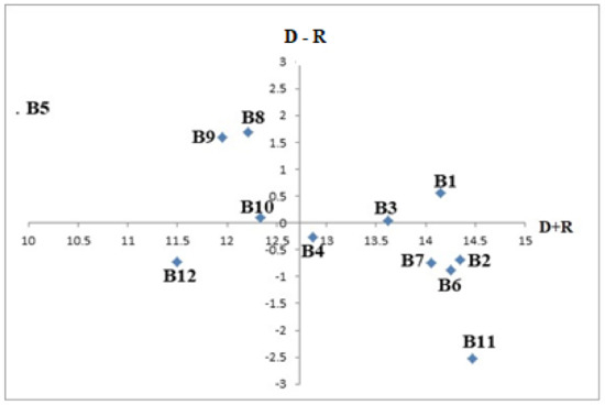 Table 8 shows the initial reachability matrix as a result of this conversion rule as shown in Table 7. For example, the relationship between the obstacles B6 and B10 is ‘X’ in the SSIM. That relationship in the converted cell (B6, B10) is ‘1′ and ‘1′ is noted in cell (B10, B6). In addition, the relationship of obstacles B4 and B12 is ‘V’; this is converted in reachability matrix as ‘1′ in cell (B4, B12), and cell (B12, B4) is ‘0′. Furthermore, the final reachability matrix, in which the dependence and driving power of all obstacles were disclosed, was displayed in Table 9. Afterwards, the transitivity rule could be used to convert the initial reachability matrix to the final reachability matrix [80]. The rule of transitivity was exploited to describe the contextual relationship among obstacles as follows: if obstacle A can influence obstacle B, and obstacle B can influence obstacle C, then obstacle A will inevitably influence obstacle C, as presented in Table 9.