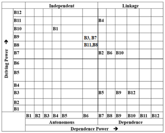 The ISM results were further generalized using cross-impact matrix multiplication applied to classification (MICMAC) analysis to calculate the driving and dependence power, which were then converted into a MICMAC matrix. MICMAC analysis investigates hidden and indirect relationships and determines how much one aspect influences another in the classification of obstacles [75]. Chen et al. [76] noted that the primary aim of the MICMAC approach is to determine the driving power and dependence power of all obstacles. Dependence power refers to the degree to which others influence one obstacle, while driving power is defined as the degree of influence that one obstacle exerts on another. A MICMAC matrix was developed according to the driving and dependence powers of the CE adoption obstacles. In the matrix, the vertical axis stands for the extent of the driving power, and the horizontal axis symbolizes the extent of the dependence power. The following four clusters were classification of the CE adoption obstacles: