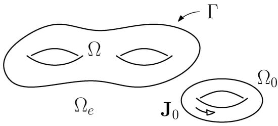 Note that the use of an “electric variable” makes it possible to also model parts of that are non-conducting (i.e., , with locally), which is very common in practical engineering problems. On the other hand, for numerical computing purposes, the interior region has to be restricted as much as possible in order to reduce the mesh region and, in turn, the number of unknowns in the discretized model. (10) can be solved after imposing Dirichlet boundary conditions on , which are provided by interface conditions given in Section 2.2 and thus require the combined solution of the exterior field problem in Section 2.3. The solution of (10) is not unique if there exists any subdomain , since still fulfills (10) for any scalar potential u. Once has been obtained, all other vector fields defined in can be easily reconstructed.