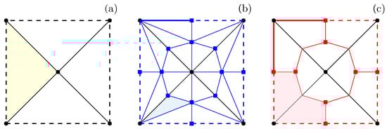 To illustrate such a geometric construction, the 2D example provided in [] is discussed here in detail. A unit square is meshed into a primal grid made of triangles (Figure 2a). The augmented dual grid in Figure 2c is obtained by assembling triangles of the barycentric subdivision (Figure 2b). Any dual cell (polygon in light red) is obtained by aggregating barycentric triangles (in light blue) around any primal node (black dots). In such a way, a one-to-one correspondence between primal nodes and dual cells is obtained. Dual nodes (red dots) are centers of domain and boundary primal cells. In the same way, on the domain boundary, , made up of 1D dual cells, is constructed by aggregating 1D barycentric cells. The other way round, a one-to-one correspondence exists also between dual nodes and primal cells, which can be either primal cells of or boundary edges of .