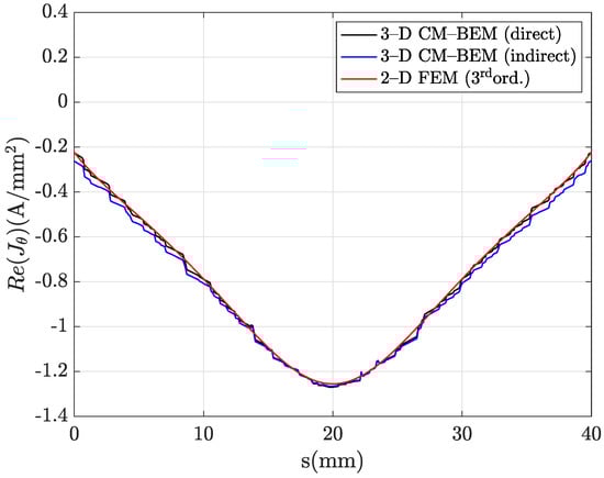 Real part of the azimuthal current density component along line A-B (black line: direct formulation, blue line: indirect formulation, red line: 2D FEM, taken as a reference).